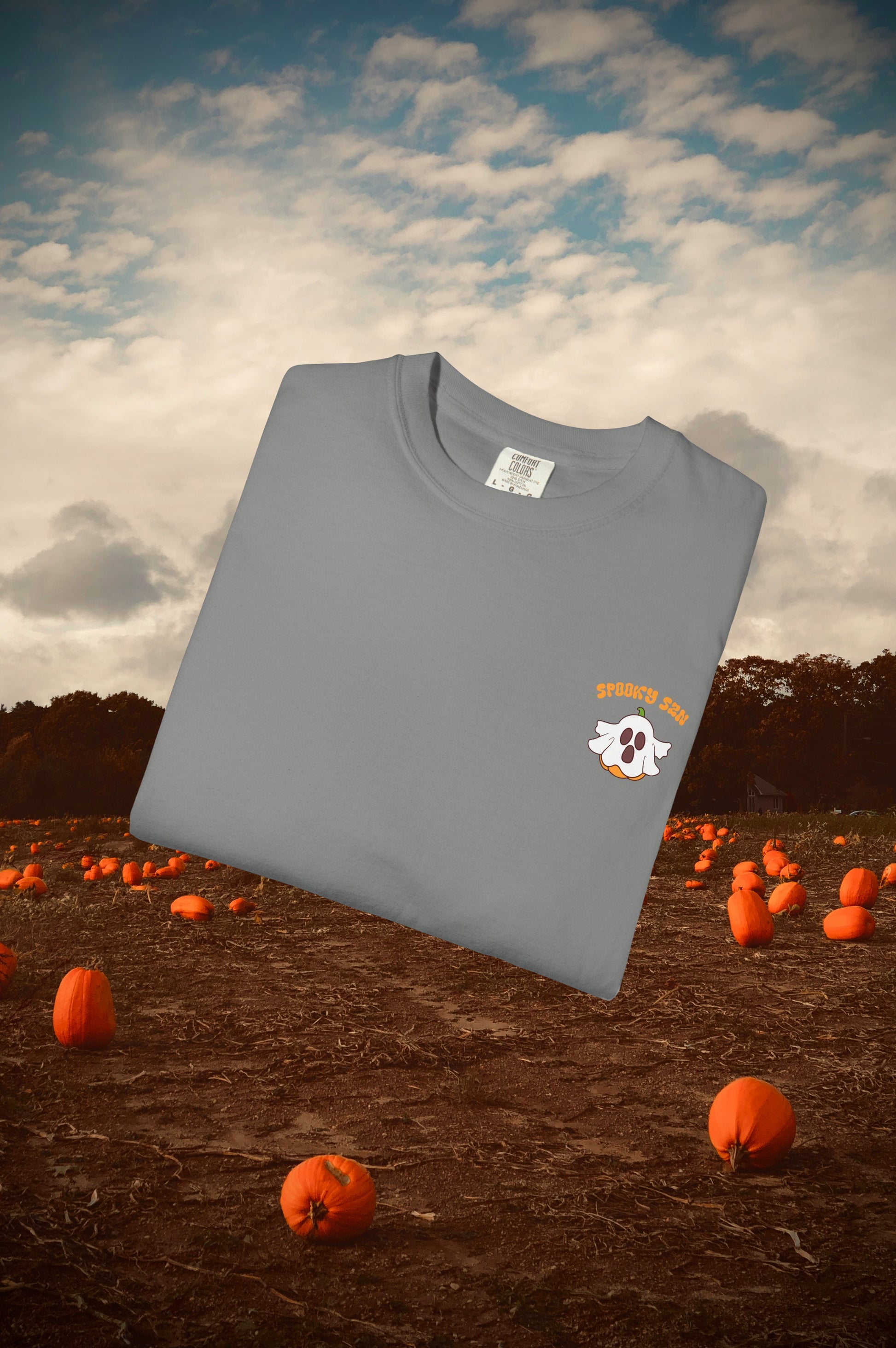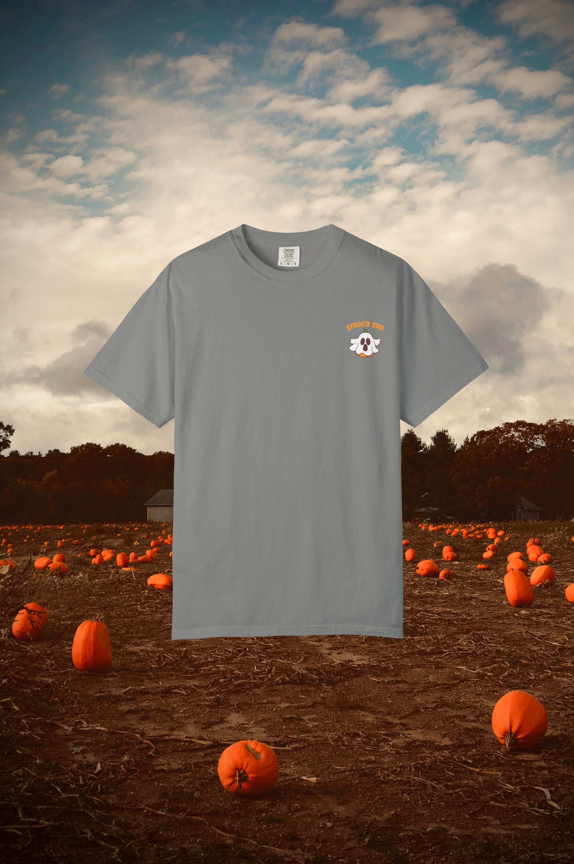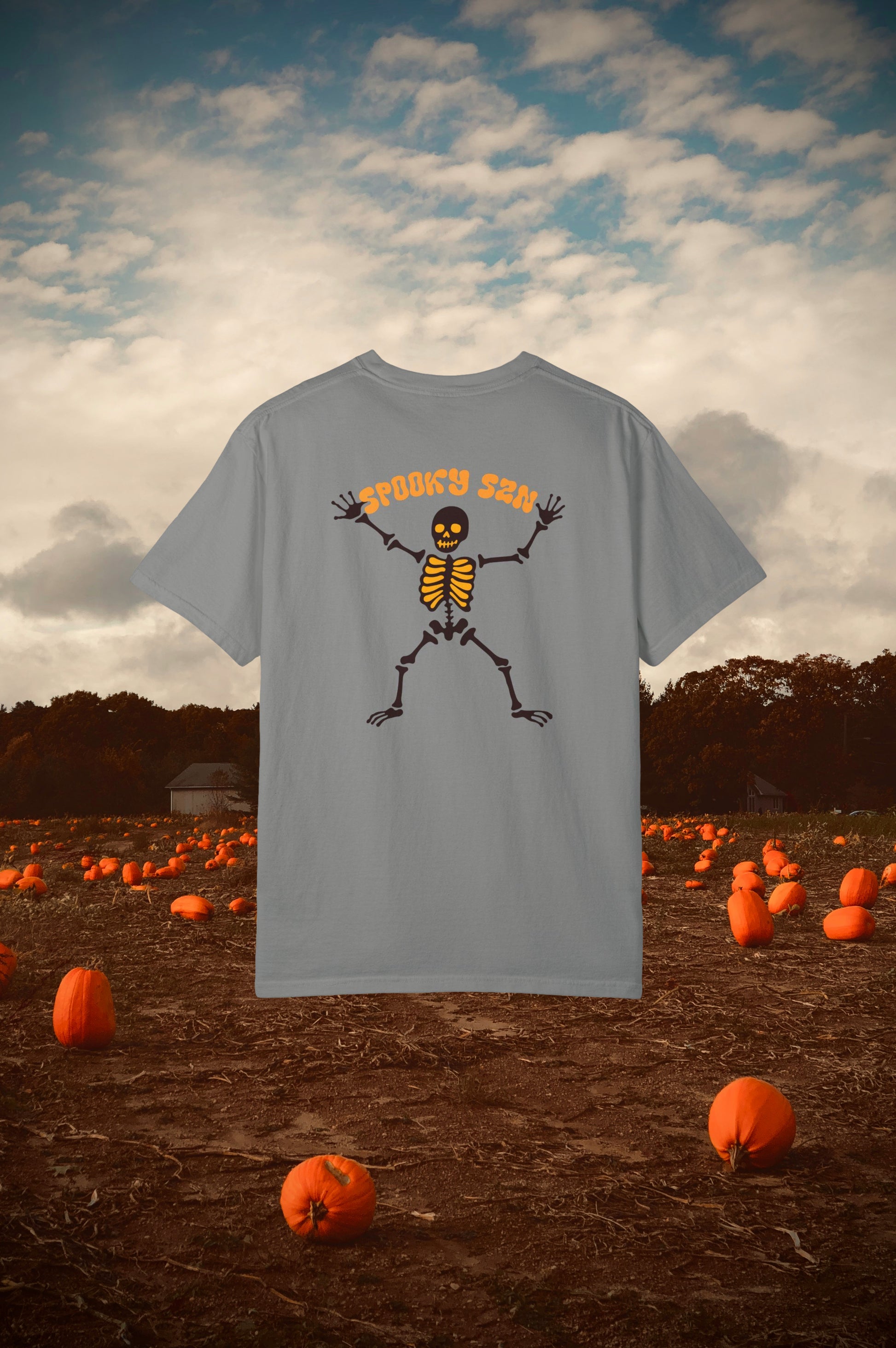 Creep it real this Halloween with the ultimate Spooky Szn tee. Featuring a friendly ghost graphic on the front and a bold dancing skeleton on the back, this shirt brings playful chills and festive vibes wherever you go.